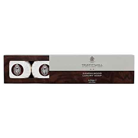 В подарочной коробке — три куска мыла с теплым ароматом сандаловой древесины. При соприкосновении с водой средства легко взбиваются в густую шелковистую пену, которая не только бережно очищает, но и обеспечивает комфортное гладкое бритье. Глицерин образует на коже тончайшую защитную пленку, которая дарит мягкость, задерживает влагу и ускоряет заживление порезов.